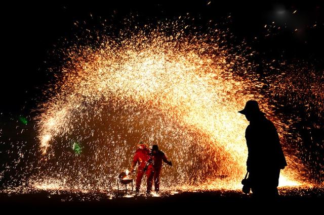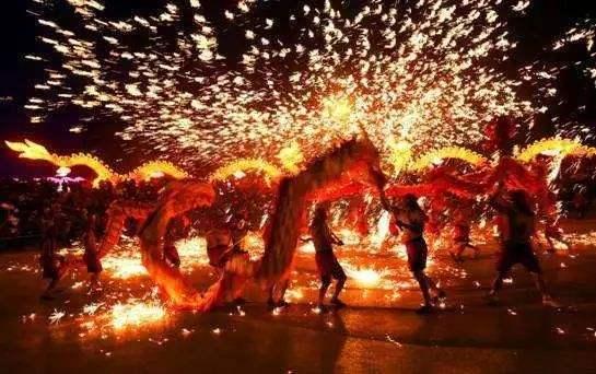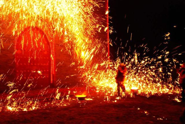 只見廣場外上空騰起炫目的火花,帶著溫度火花。人們紛紛向后退幾步,只見幾位大漢抬著熊熊燃燒的大火爐,是用風(fēng)箱加力的焦炭爐,當(dāng)中有坩堝一口,里面有沸騰的鐵水。兩位魁梧漢子,一人手握一大木板子,另一位即用大火鉗夾起坩堝,順勢傾倒在木板上,在那電光石火間,木板向上方大力揮動,只聽見呯的一響,蒼空濺射出萬千璀璨的火花,對,鐵水火花!人們驚?贊嘆且自然避讓,惟恐鐵花(從上空墜下,實已變暗退溫)落在衣服上或脖領(lǐng)中。但雄壯的東方之龍卻不但不退讓,反而迎著閃爍的鐵花迅猛舞動,使其沒機(jī)會光顧龍軀和熱吻光著上身的青年。